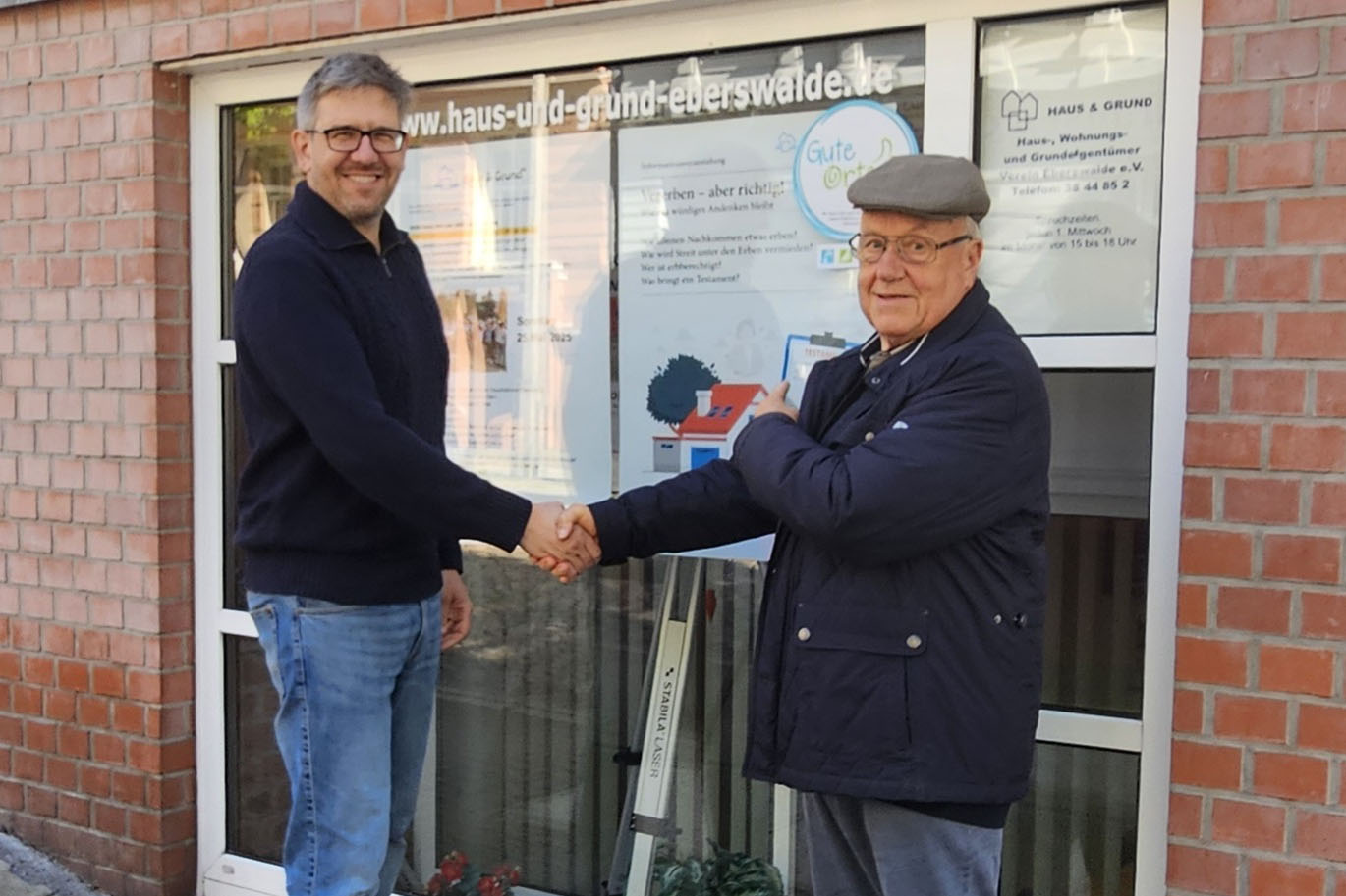 CDU-Vorsitzender Sebastian Heimann (li.) im Gespräch mit Wolfram Hey, dem Vorsitzenden von Haus & Grund EberswaldeZu einem intensiven Austausch über wohnungspolitische und stadtplanerische Themen kam es jüngst in Eberswalde: Sebastian Heimann, Vorsitzender der CDU Eberswalde, traf sich mit Wolfram Hey, Vorsitzender des städtischen Eigentümerverbands Haus & Grund sowie mit dessen Beiratsmitglied Günter Lips.